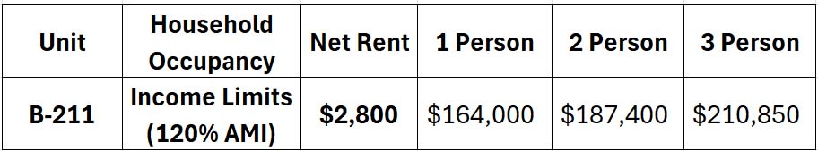 Alvin’s Corner features a limited number of Below Market Rate (BMR) apartments for income qualified applicants. The leasing process for these units in managed by Housinginc.com. If you are interested, please visit www.housinginc.org and/or email teresa@housinginc.org so that Housinginc.com may provide you with complete information about availability, income qualifications, and the application process. Income limits are based on median income and vary by floor plan type and other factors.